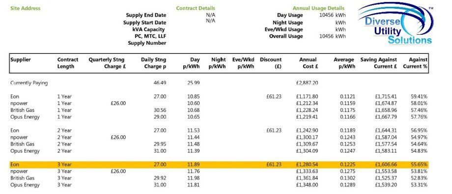 - Below this we have our proposed 1-year, 2-year and then 3-year proposed energy deals with four suppliers.